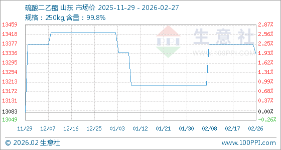 2月27日,生意社硫酸二乙酯基准价为13333.33元/吨,与本月初(13200.00元/吨)相比,上涨了1.01%。