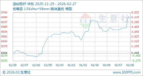 2月27日,生意社涤纶短纤基准价为6685.69元/吨,与本月初(6649.67元/吨)相比,上涨了0.54%。