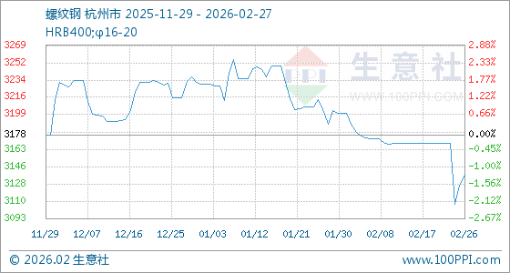 2月27日,生意社螺纹钢基准价为3138.66元/吨,与本月初(3200.34元/吨)相比,下降了1.93%。