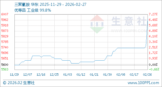2月27日,生意社三聚氰胺基准价为5970.00元/吨,与本月初(5675.00元/吨)相比,上涨了5.20%。