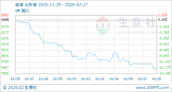 2月27日,生意社柴油基准价为5663.00元/吨,与本月初(5922.40元/吨)相比,下降了4.38%。