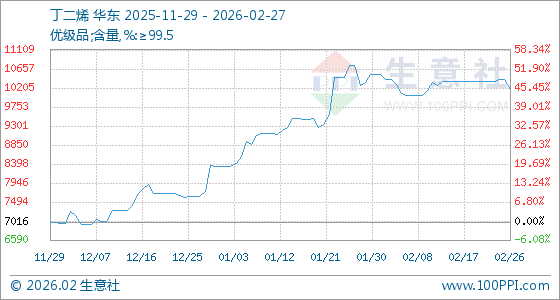 2月27日,生意社丁二烯基准价为10166.67元/吨,与本月初(10533.33元/吨)相比,下降了3.48%。