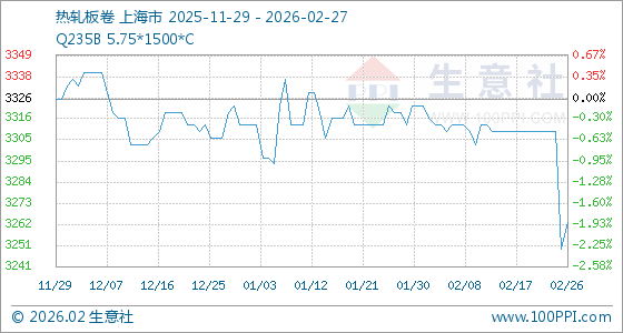 2月27日,生意社热轧板卷基准价为3263.33元/吨,与本月初(3323.33元/吨)相比,下降了1.81%。