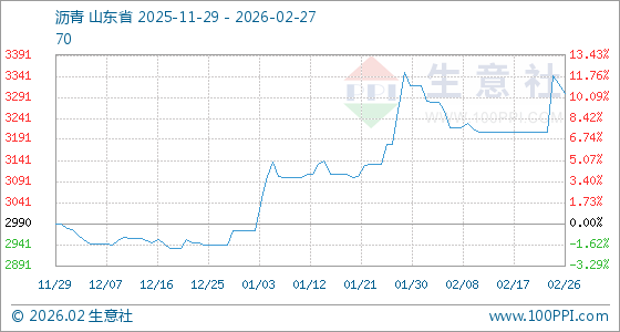 2月27日,生意社沥青基准价为3300.00元/吨,与本月初(3320.00元/吨)相比,下降了0.6%。