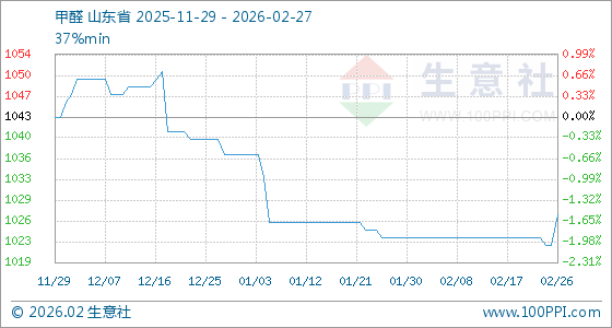 2月27日,生意社甲醛基准价为1027.50元/吨,与本月初(1023.75元/吨)相比,上涨了0.37%。
