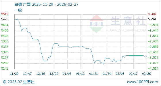2月27日,生意社白糖基准价为5306.67元/吨,与本月初(5295.00元/吨)相比,上涨了0.22%。
