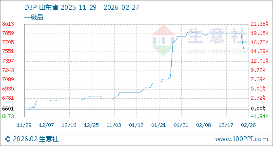 2月27日,生意社DBP基准价为7601.67元/吨,与本月初(7818.33元/吨)相比,下降了2.77%。