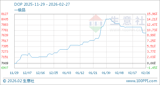 2月27日,生意社DOP基准价为7700.84元/吨,与本月初(8017.50元/吨)相比,下降了3.95%。