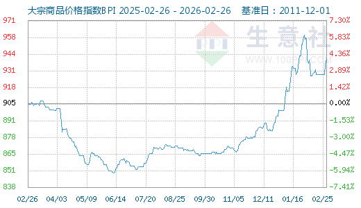 2月26日大宗商品价格指数BPI为946点, 较昨日上升了5点 , 较周期内最高点1343点(2021-10-19)下降了29.56%,较2016年02月03日最低点660点上涨了43.33%。