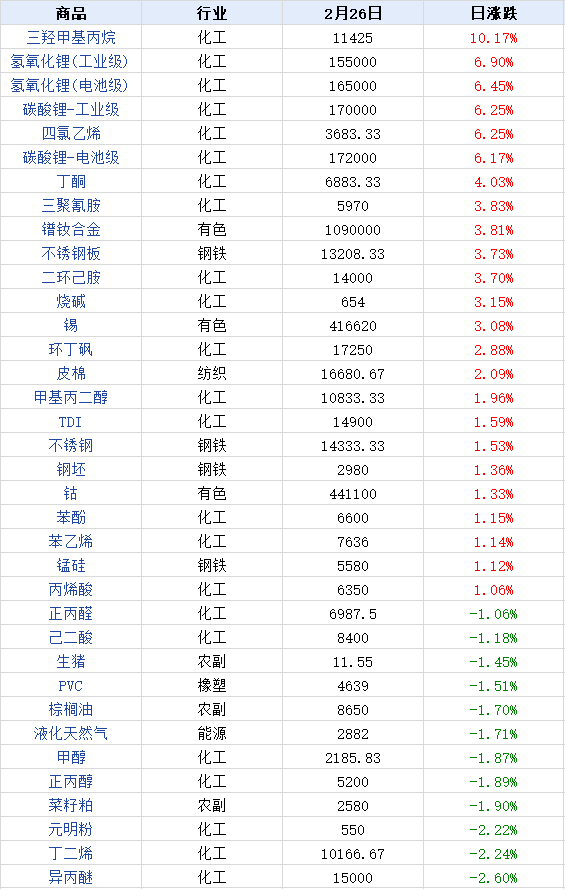 据生意社价格监测,2026年2月26日大宗商品价格涨跌榜中环比上升的商品共68种,集中在化工板块(共31种)和钢铁板块(共11种),涨幅在5%以上的商品主要集中在化工板块;涨幅前3的商品分别为三羟甲基丙烷(10.17%)、氢氧化锂(工业级)(6.90%)、氢氧化锂(电池级)(6.45%)。 环比下降的商品共44种,集中在化工(共15种)和橡塑(共7种),跌幅前3的商品分别为异丙醚(-2.60%)、丁二烯(-2.24%)、元明粉(-2.22%)。
