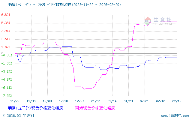 甲醇(出厂价)与丙烯价格走势比较图
