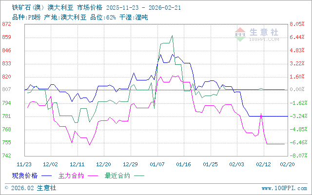- 2月11日生意社铁矿石(澳)基准价为781 02-11