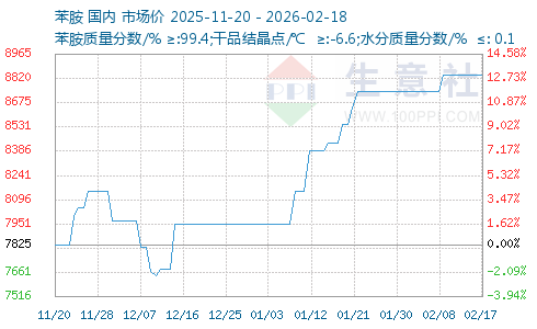 | 苯胺质量分数/% ≥:99.4;干品结晶点/℃ ≥:-6.6;水分质量分数/% ≤: 0.1 | 8100元/吨 | 30吨 | 即期现货 | 山东省 | 02-13 08:05 | 3天 |