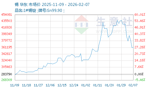 | 锡锭 牌号:Sn99.90 | 378100元/吨 | 33吨 | 即期现货 | 上海 | 02-05 13:20 | 1天 |