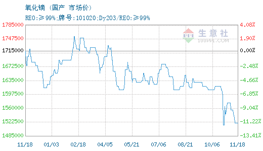 11月18日,氧化镝参考价为1520000.00,与11月1日(1575000.00)相比,下降了3.49% 2025-11-18 16:38
