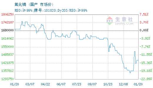 1月20日,氧化镝参考价为1445000.00,与1月1日(1360000.00)相比,上涨了6.25% 2026-01-20 16:38