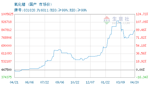 4月17日,氧化镨参考价为835000.00,与4月1日(772500.00)相比,上涨了8.09% 2026-04-17 16:38