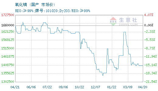4月17日,氧化镝参考价为1405000.00,与4月1日持平 2026-04-17 16:38