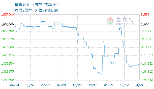 4月23日,镝铁合金参考价为1375000.00,与4月1日(1360000.00)相比,上涨了1.1% 2026-04-23 16:38