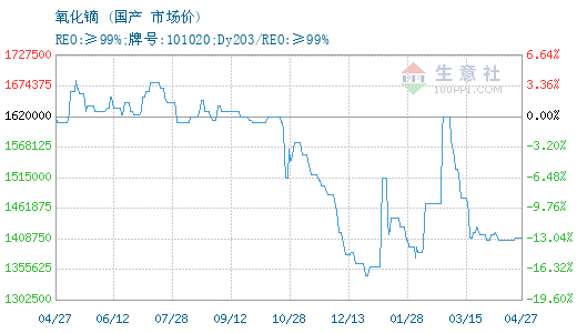 4月24日,氧化镝参考价为1410000.00,与4月1日(1405000.00)相比,上涨了0.36% 2026-04-24 16:38