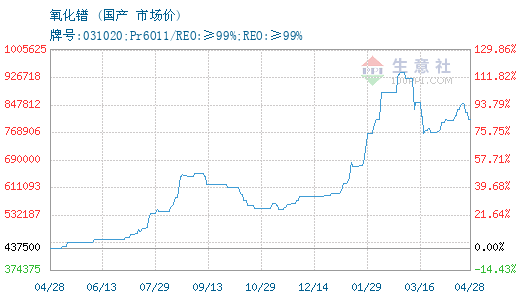 - 04-274月27日生意社氧化镨基准价为825000.00元/吨