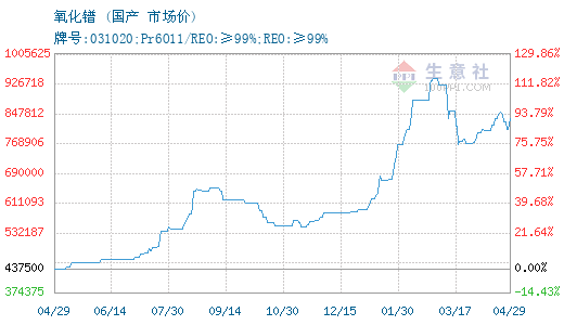 - 04-284月28日生意社氧化镨基准价为805000.00元/吨